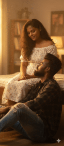 Make my photo like a A young, romantic Indian couple in a cozy, softly lit room. The man is sitting on the floor, looking up lovingly at the woman, who is seated on a low bed. He has a beard and is wearing a dark plaid shirt and ripped jeans. The woman has long, wavy brown hair and is wearing a white, off-the-shoulder dress with a floral pattern.