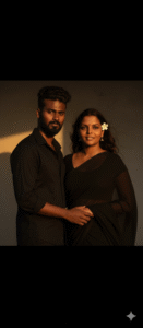 He will be holding my saree pallu in his hand, dressed in a retro style with a black shirt, carrying a Dev Anand-inspired look.| will be in a perfect plain chiffon saree, black