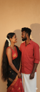 Convert, 4k HD realistic, A stunning portrait of a young Indian woman with 264 long, dark, wavy hair cascading over her shoulders and young indian men with handsome look. She is wearing a red cotton butta saree, elegant black saree draped over one shoulder, revealing a fitted sleeveless blouse underneath and he wear a red shirt and white dhothi. White flowers are tucked behind her right ear. Both are looking each other