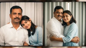 Prompt 2: “I am giving two photos one of me and one of my mother. Please generate a realistic portrait of us together in a studio-like setting. Make my mother stand beside me, wearing a traditional saree with elegant patterns, simple jewelry, and a calm expression. Position me sitting on a chair in front of her, wearing a shirt and dhoti with a border design. Ensure she has one hand gently resting on my shoulder, showing a warm mother-and-son bond. Keep the background plain with soft lighting, giving the image a natural, realistic, and timeless painted portrait feel.”