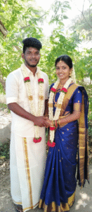 Add an tamil nadu girl her age 22 in this photo and tamil nadu marriage style cotton vesti shirt and cotton saree, wedding garland