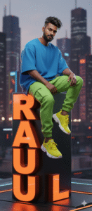 reference photo) in a dynamic full-body pose. The subject wears casual relaxed outfits in bold colors (shirt, pants, shoes), appearing stylish and modern. Add a single text ‘YOUR NAME displayed vertically, rendered as large 3D block glossy letters in a bold contrasting color. The text should appear only once, without repetition, and be big enough to look like a real object. Make the model interact with the text, for example sitting on